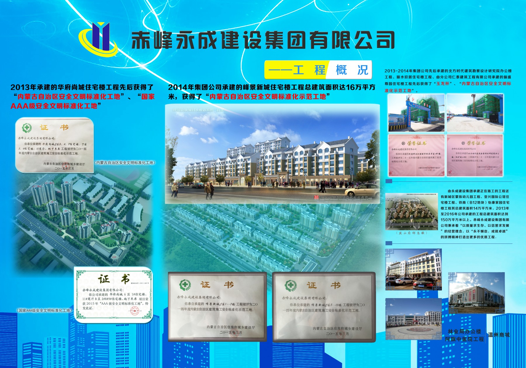 集團公司被內(nèi)蒙古自治區(qū)工商行政管理局評為“守合同重信用企業(yè)”。集團公司把“自治區(qū)安全標注化示范工地”和“建筑主體優(yōu)質(zhì)工程--“玉龍杯”作為工程施工的常態(tài)化要求,2013年以來有10個項目被評為自治區(qū)安全標準化示范工地,有6個工程被評赤峰市建筑主體優(yōu)質(zhì)工程--玉龍杯,獲得兩項內(nèi)蒙古自治區(qū)建設(shè)工程省級施工工法。2015年集團公司榮獲全國“AAA級安全標準化示范工地”、 榮獲內(nèi)蒙古自治區(qū) “安康杯”優(yōu)勝企業(yè)、全國建筑業(yè)“AAA級信用企業(yè)”,公司已通過OHSAS18000職業(yè)健康安全體系認證、ISO14001環(huán)境管理體系認證、ISO9001質(zhì)量管理體系認證,2016年集團公司被評為“內(nèi)蒙古自治區(qū)建筑業(yè)優(yōu)秀企業(yè)”。