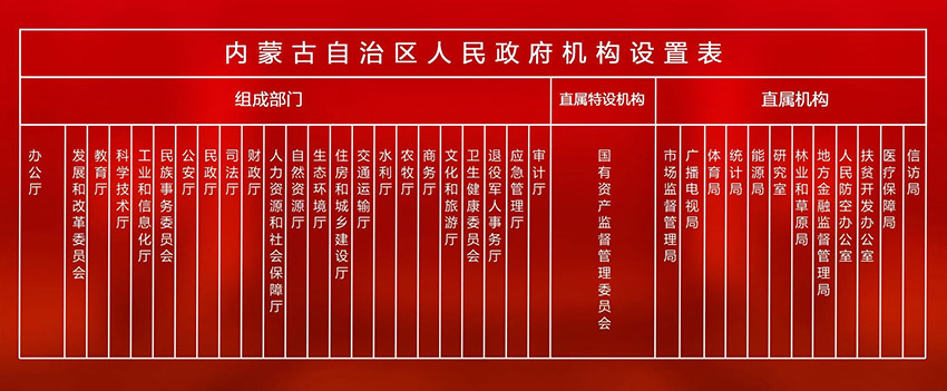 內(nèi)蒙古自治區(qū)人民政府設(shè)置工作部門(mén)36個(gè)。其中,辦公廳和組成部門(mén)23個(gè),直屬特設(shè)機(jī)構(gòu)1個(gè),直屬機(jī)構(gòu)12個(gè)。民族事務(wù)委員會(huì)掛蒙古語(yǔ)文工作委員會(huì)牌子;研究室掛參事室牌子;市場(chǎng)監(jiān)督管理局掛知識(shí)產(chǎn)權(quán)局牌子;地方金融監(jiān)督管理局掛政府金融工作辦公室牌子;政府外事辦公室與自治區(qū)黨委外事工作委員會(huì)辦公室合署辦公,不計(jì)入機(jī)構(gòu)限額。醫(yī)療保障局規(guī)格為副廳級(jí)。