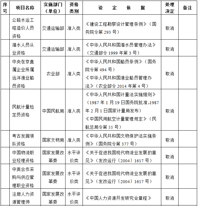 國(guó)務(wù)院決定取消的職業(yè)資格許可和認(rèn)定事項(xiàng)目錄