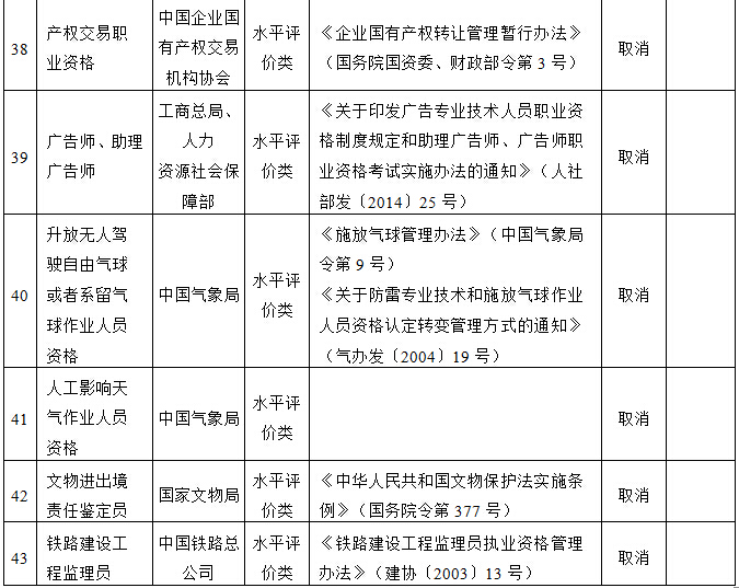 一、取消的專業(yè)技術(shù)人員職業(yè)資格許可和認(rèn)定事項(xiàng)(共計(jì)43項(xiàng),其中準(zhǔn)入類5項(xiàng),水平評(píng)價(jià)類38項(xiàng))