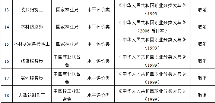 二、取消的技能人員職業(yè)資格許可和認(rèn)定事項(xiàng)(共計(jì)18項(xiàng),均為水平評(píng)價(jià)類)