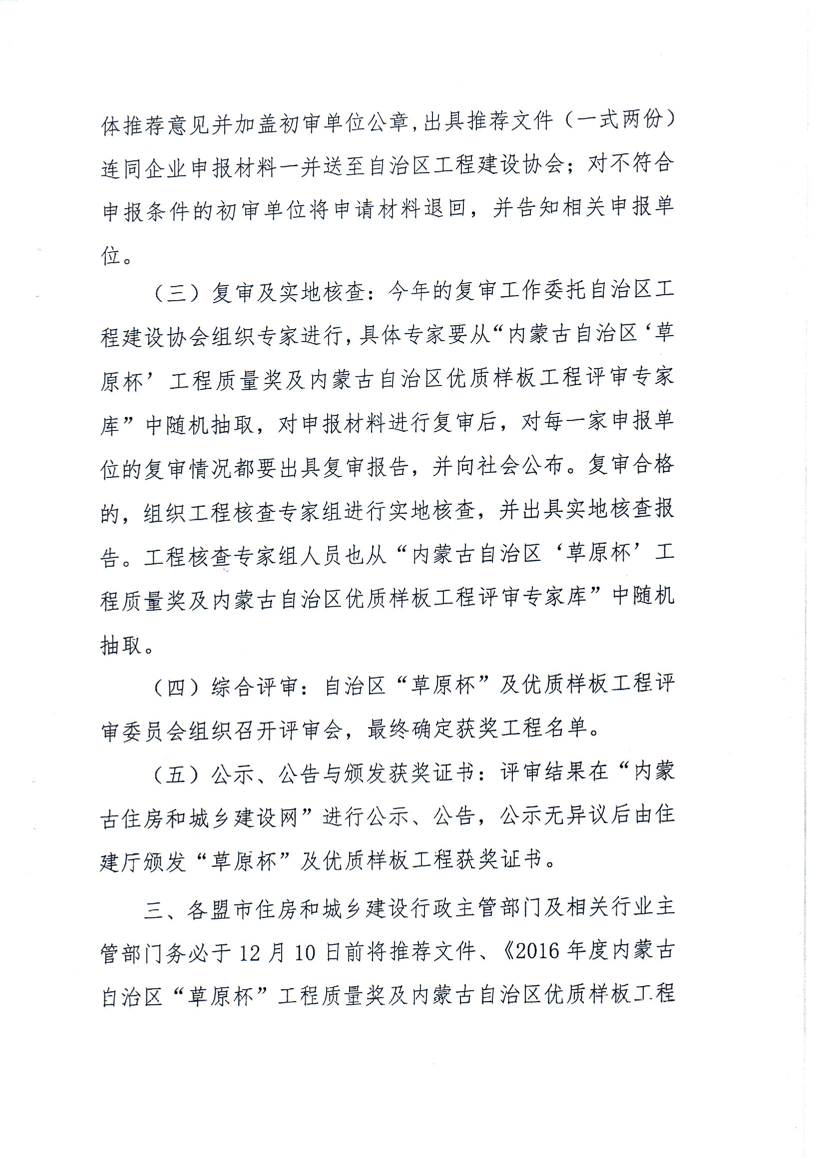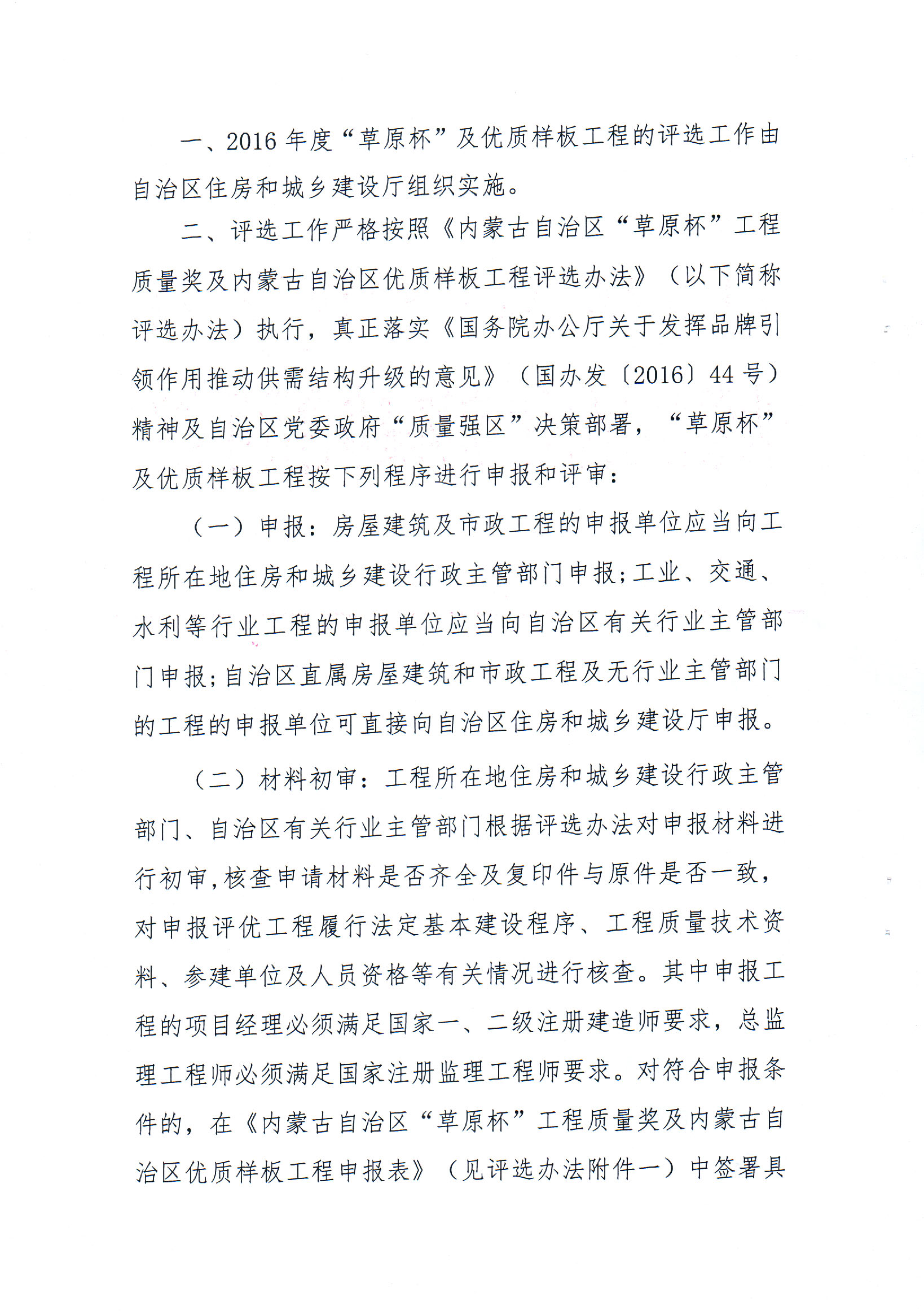 關于開展2016年度內蒙古自治區(qū)“草原杯”工程質量獎及內蒙古自治區(qū)優(yōu)質樣板工程評選工作的通知